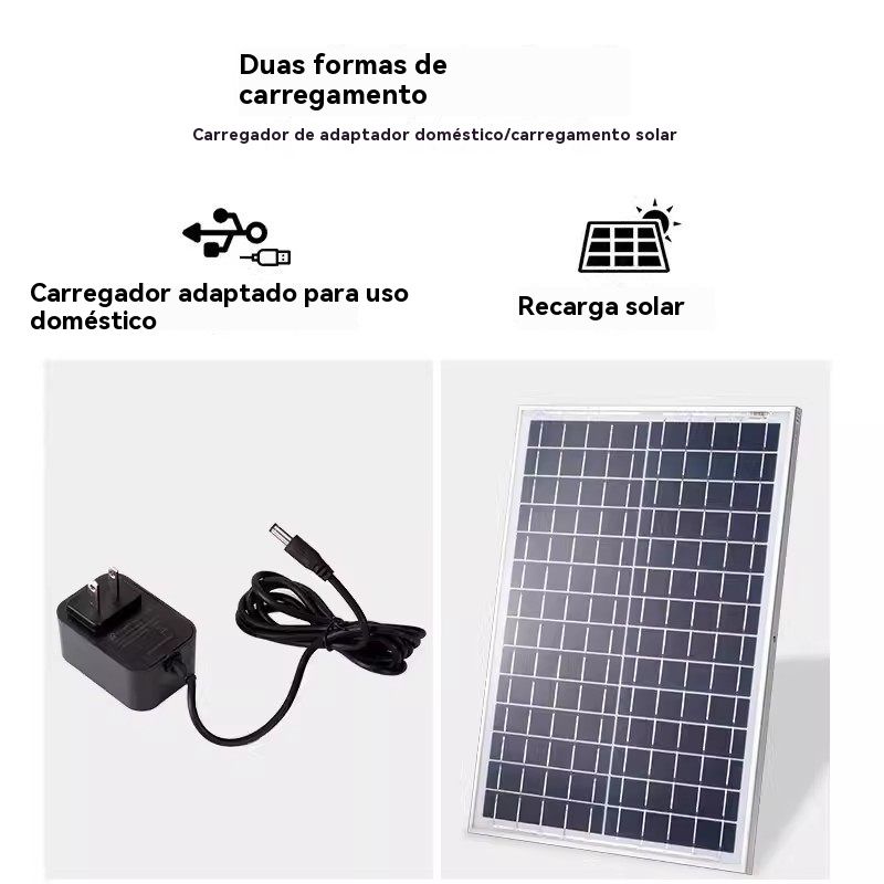 • Carregamento solar + USB: energia contínua, mesmo sem luz elétrica