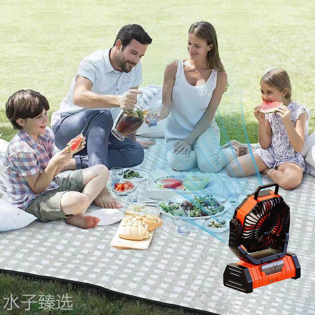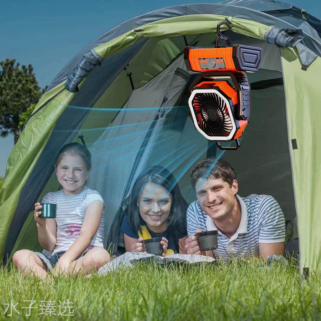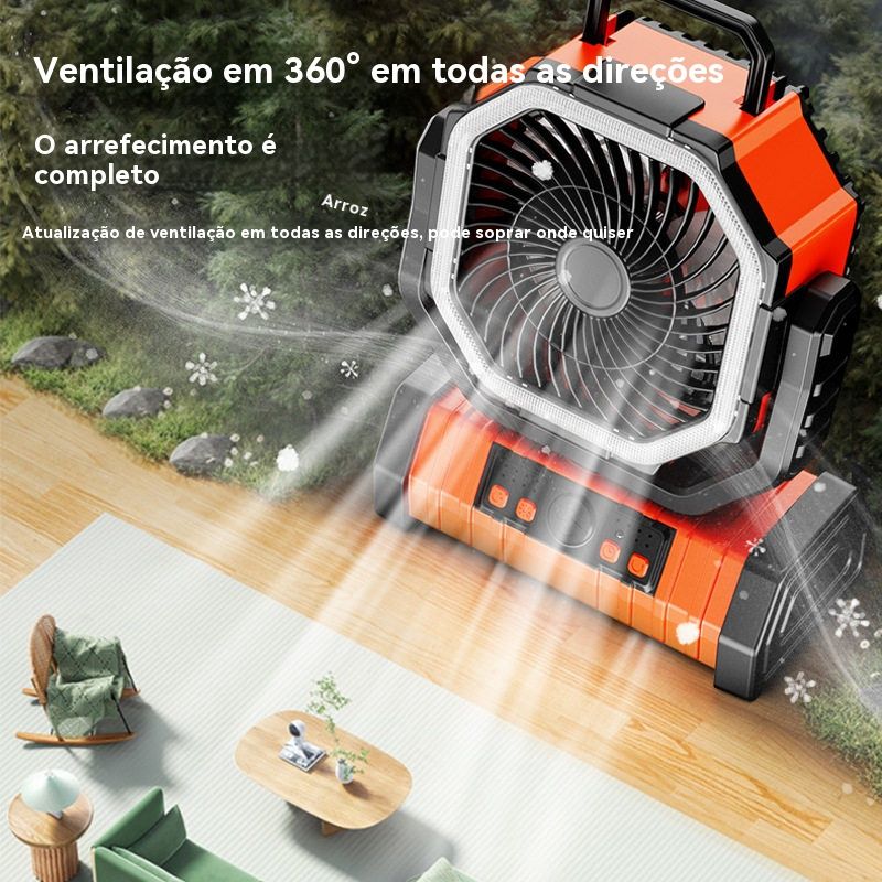 Acampamento ao Ar Livre: Fornece vento contínuo e refrescante dentro da tenda ou no acampamento, servindo também como iluminação de emergência e fonte de energia para carregar celulares e outros dispositivos.